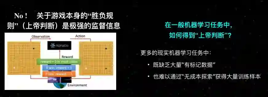 真正的现实应用中哪里能得到这样的上帝规则?根本得不到。我们也不可能通过无成本探索像围棋这样获得大量的样本。我们没有办法去做真正的不需要任何数据,不需要任何标记的学习。