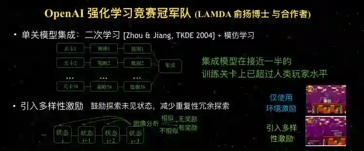 另外一个技术是我们通过集成学习研究得到启发,引入多样性激励。如果只使用传统强化学习环境的激励,进去好的状态之后就很难再探索了;而现在引入多样性激励之后,一个地方做得好,会自动去探索别的地方。