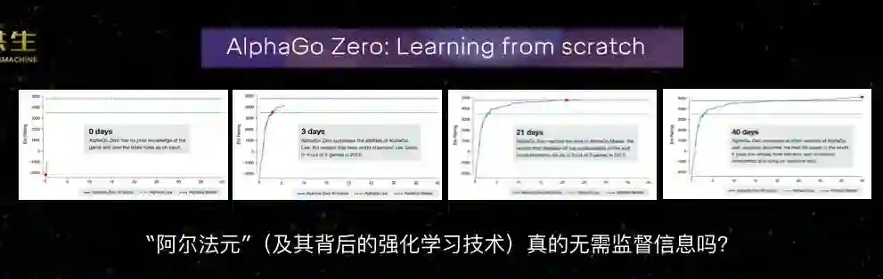 所谓的AlphaZero,DeepMind说它是“从零开始学习”,第一天没有任何数据,第三天超过战胜李世石的版本,第21天超过Alpha Master,第40天达到人类见到的最强能力。中间没有用任何人类的棋局,这是不是意味着它背后的强化学习技术真的不需要监督信息?