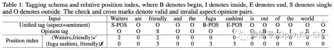 第二阶段:从第一阶段得到的方面词和情感词两两组合可以得到所有的情感方面三元组。我们利用方面词和情感词的绝对距离编码为它们之间的位置相对关系信息。再使用二分类判断当前三元组是否正确。示意图可以见表1。