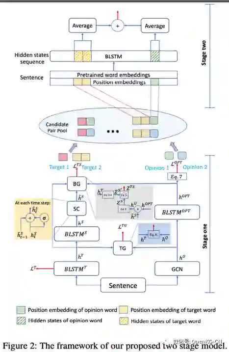 。另一分之中对于观点词语抽取我们使用GCN抽取句子结构信息与经过BLSTM抽取的句子信息拼接一起后经过softmax做情感词语标注(TG),此阶段训练损失为