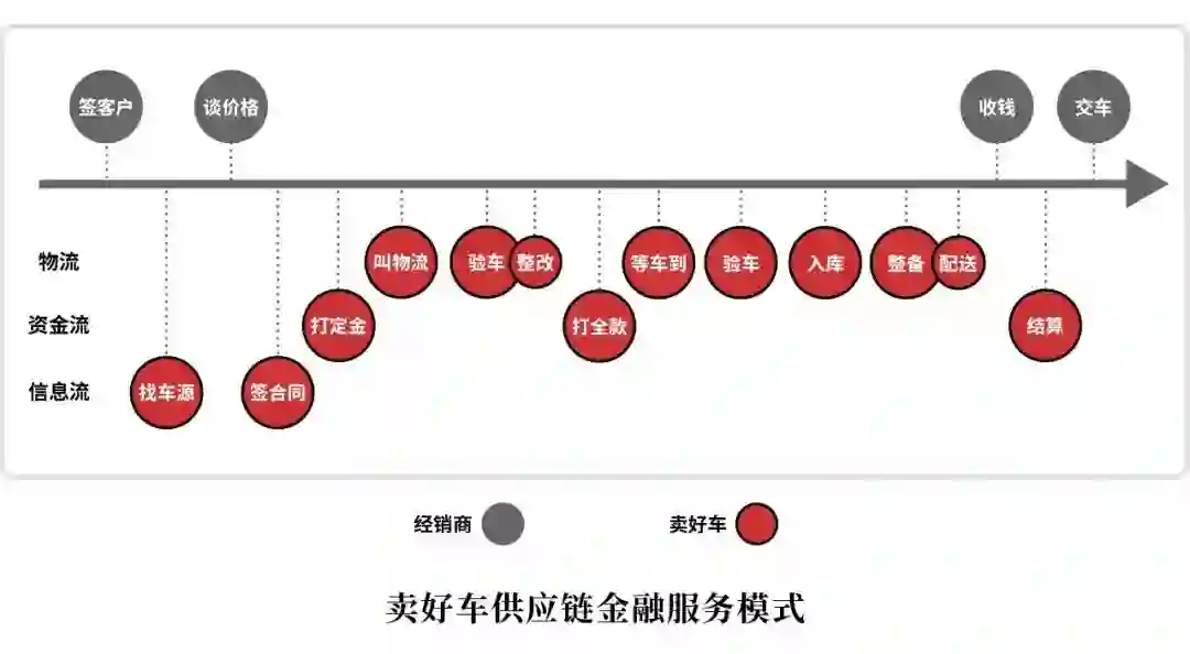 另一种是交易类的贸易形态。当经销商获得了准确的C端需求后,向上游采购车辆,在这笔交易中,经销商将保证金(通常为20%)交给卖好车,卖好车向上游卖家支付全款,然后由卖好车负责去找上游卖家验车、提货,运输至距离经销商最近的卖好车的仓中,等C端消费者提车、付款后,经销商再向卖好车支付全款。
