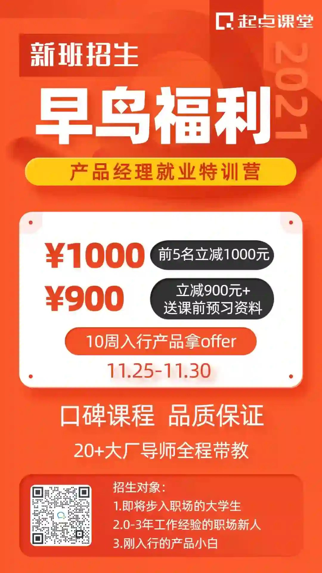 新一期特训营早鸟特惠,目前还有福利活动,如果你还在焦虑自己能否走上产品之路,可以扫描下方二维码领个优惠券+咨询课程详情,期待你的蜕变~