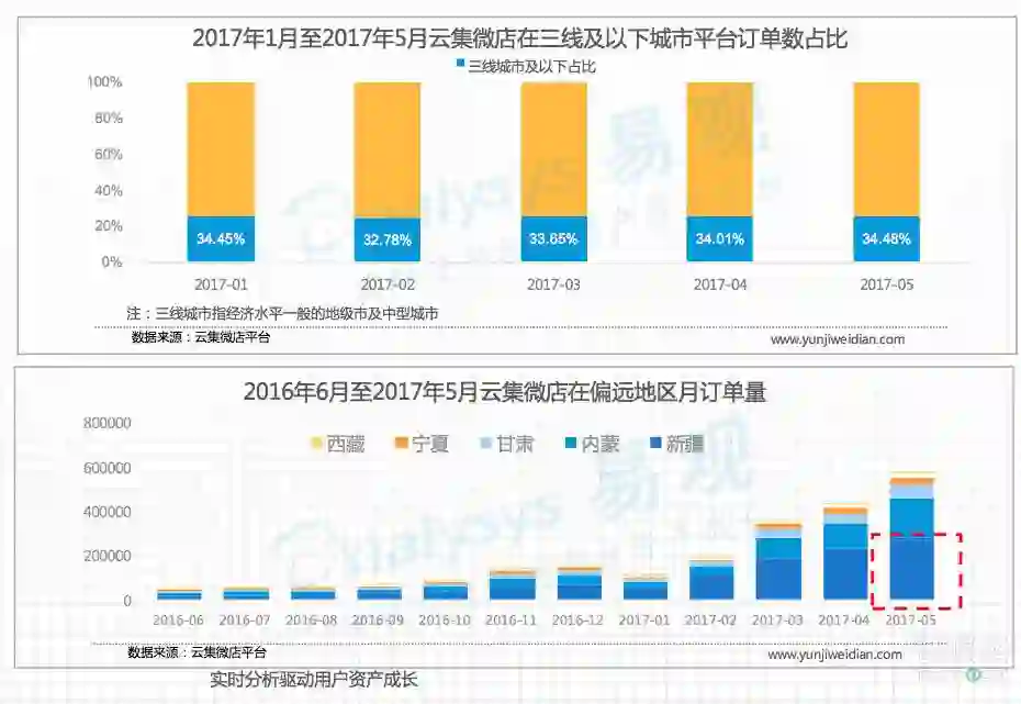 云集微店在三线以下城市订单数占比及偏远地区月订单量