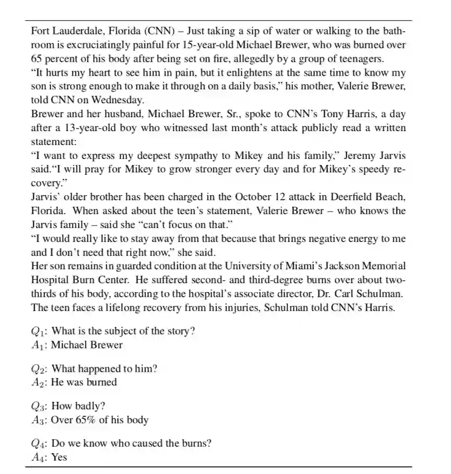 是否有一种综合评价可以检验所有这些方面,并探索更深层次的理解?我们认为,阅读理解的任务——在一篇文章中回答理解性问题——是一种恰当而重要的方法。就像我们使用阅读理解测试来衡量一个人对一段文字的理解程度一样,我们相信它也可以在评估计算机系统对人类语言的理解程度方面发挥同样的作用。【译者注,这个和我们利用阅读理解来判定一个人的语言水平是类似的思想,所以高考的阅读理解是很有意义的】