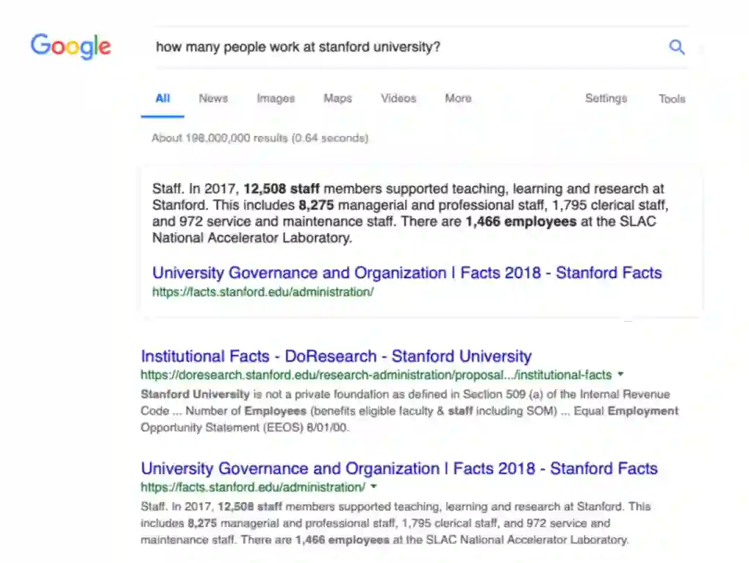 本文的第二个中心主题是,我们深信,如果我们能够构建出高性能的阅读理解系统,它们将成为问答和对话系统等应用的关键技术(they would be a crucial technology for applications such as question answering and dialogue systems)。事实上,这些语言技术已经与我们的日常生活息息相关。例如,如果我们今天在谷歌中输入一个搜索查询“how many people work at stanford univerisity?””(Figure 1.2),谷歌不仅返回搜索文档列表,还尝试读取这些Web文档,最后突出显示最可信的答案,并将它们显示在搜索结果的顶部。我们相信这正是阅读理解可以起作用的地方,因此可以促进更智能的搜索引擎。此外,随着亚马逊(Amazon)的ALEXA、苹果(Apple)的SIRI、谷歌ASSISTANT或微软(Microsoft)的小娜(CORTANA)等数字个人助理的发展,越来越多的用户通过询问有关信息的问题来参与到这些设备(的建设中)[^1]。我们相信,建造能够阅读和理解文本的机器将会极大的改善这些个人助理的能力。