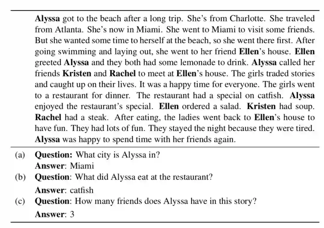 最后一个问题特别具有挑战性。为了得到正确的答案,机器必须记住文本中提到的所有人的名字和他们之间的关系,进行一些算术推理(计数),最后给出一个答案。