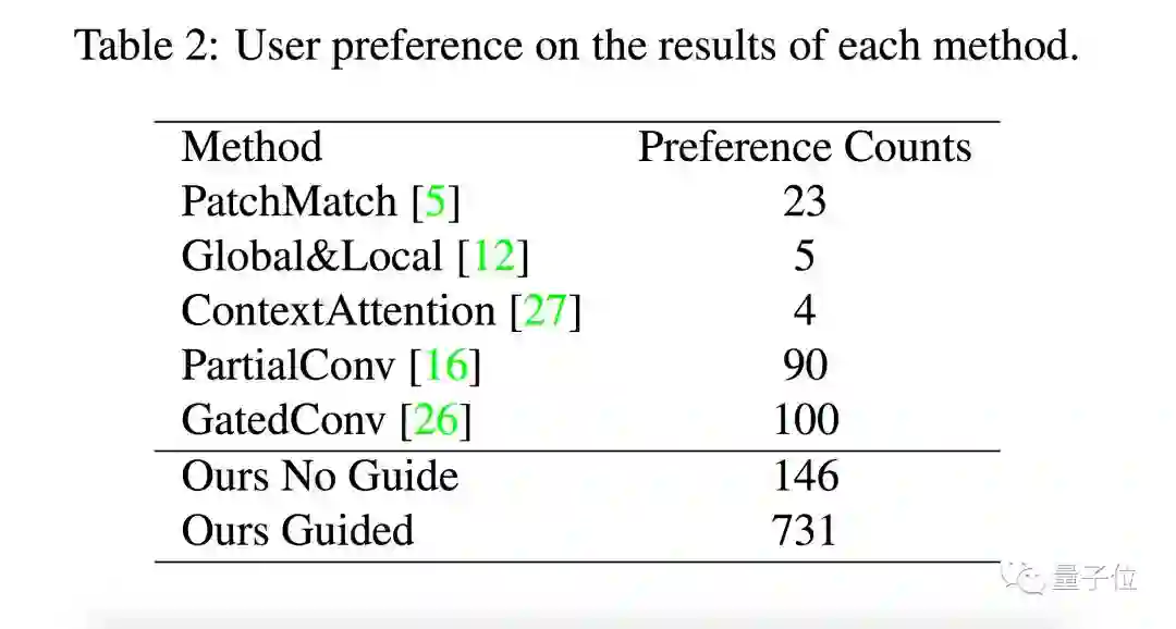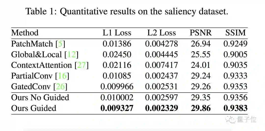 从这张数据对比表可以看出来,前景感知图像修复,在各类结果数据中都是最优秀的,超过了PatchMatch、Global&Local、ContextAttention、PartialConv、GatedConv五大对手。