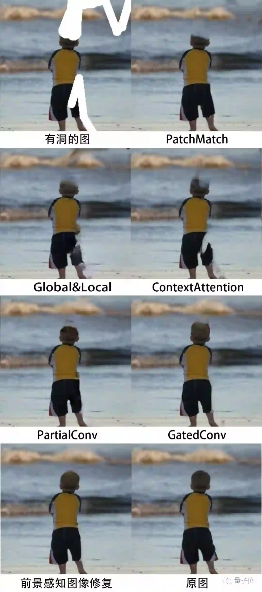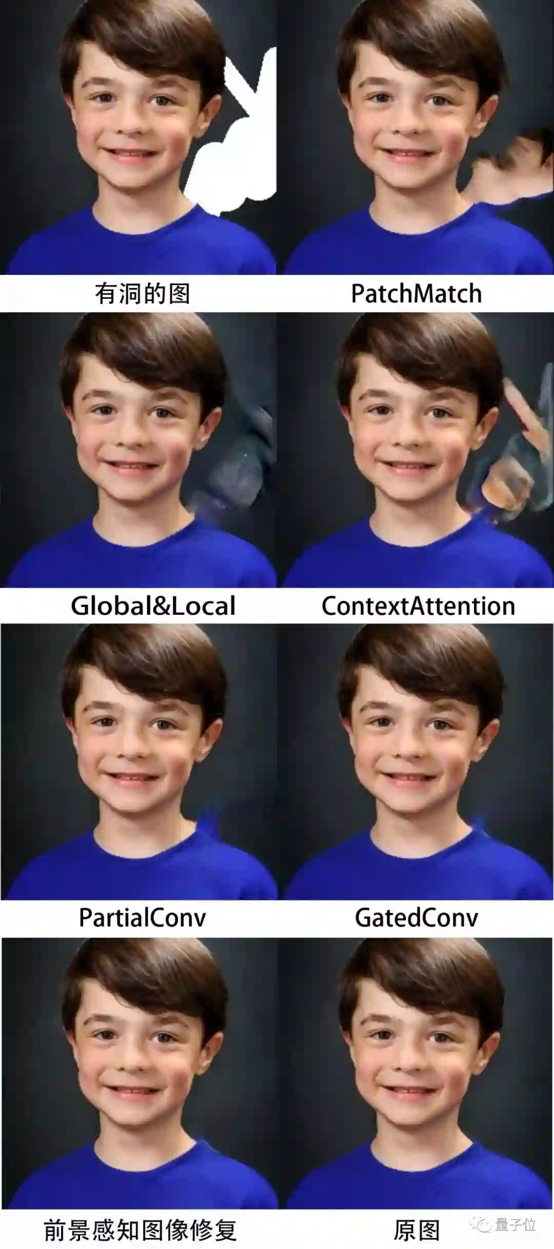 而头顶的部分,前景感知图像修复算法是唯一一个把头顶修复清晰的,虽然小男孩看起来年纪轻轻,发际线不低,但整张图片都是完整清晰的。