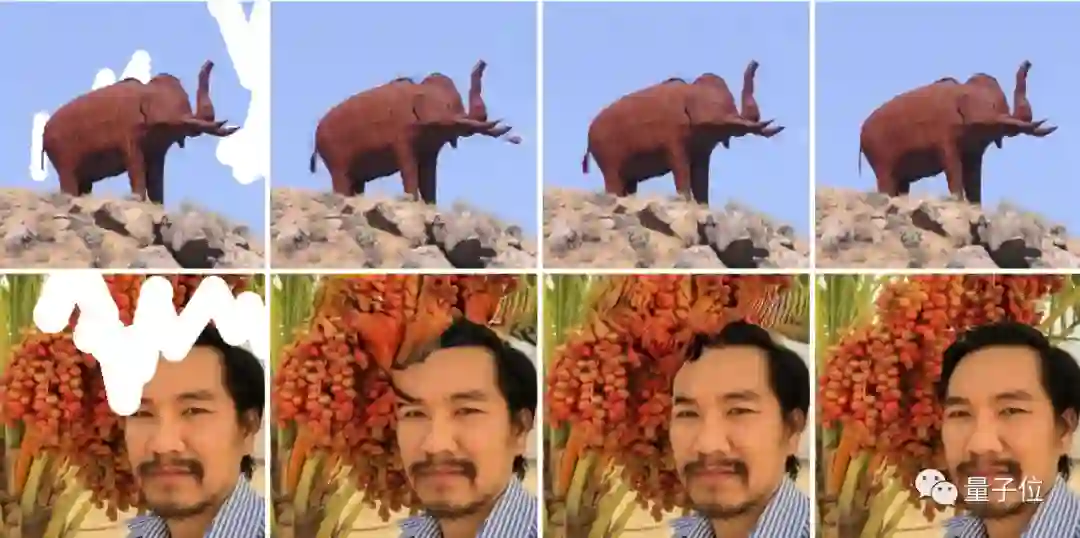 没有轮廓补全模块的修复图像,脑门、头发、水果浑然一体,并没有很好地区分开。轮廓补全模块的修复图像,虽然仍旧不太完美,但效果要好得多。