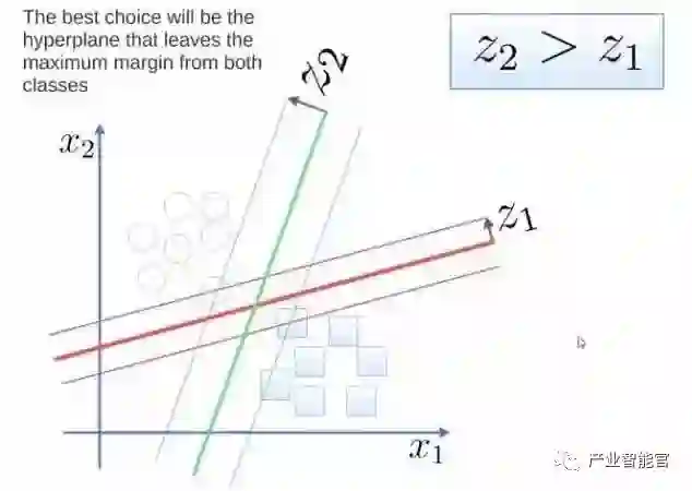要将两类分开,想要得到一个超平面,最优的超平面是到两类的 margin 达到最大,margin就是超平面与离它最近一点的距离,如下图,Z2>Z1,所以绿色的超平面比较好。