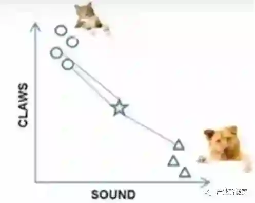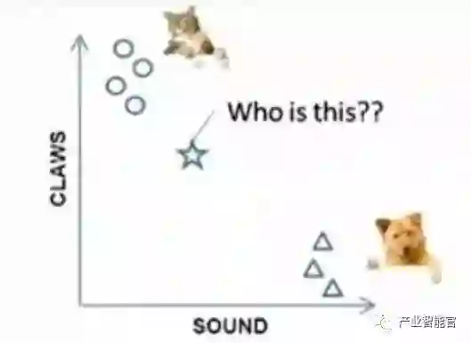 例子:要区分“猫”和“狗”,通过“claws”和“sound”两个feature来判断的话,圆形和三角形是已知分类的了,那么这个“star”代表的是哪一类呢?