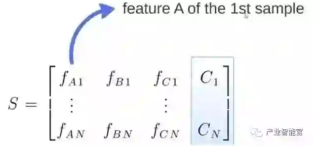 S矩阵是源数据,有1-N条数据,A、B、C 是feature,最后一列C是类别: