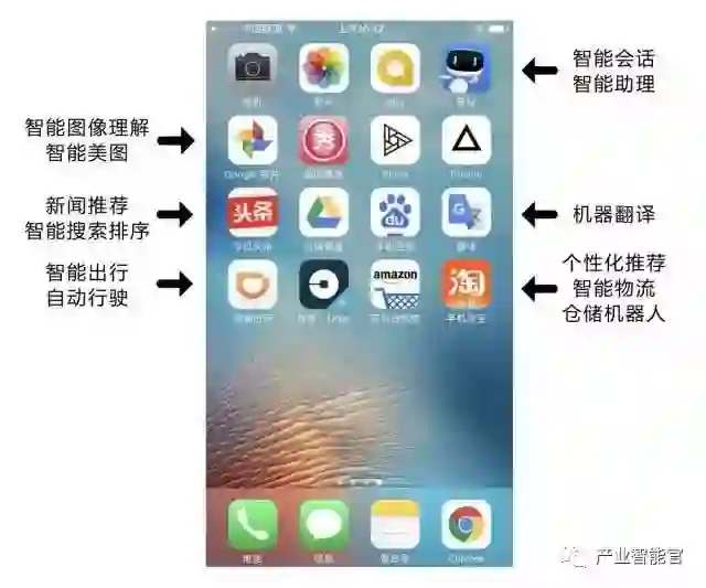 下图是一部典型的智能手机上安装的一些常见应用程序,可能很多人都猜不到,人工智能技术已经是手机上很多应用程序的核心驱动力。