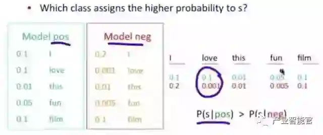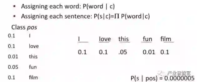 问题变成,这一类中这句话出现的概率是多少,当然,别忘了公式里的另外两个概率。例子:单词“love”在positive的情况下出现的概率是 0.1,在negative的情况下出现的概率是0.001。