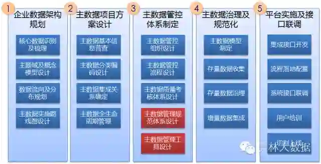 主数据项目属于典型的“企业级应用”,,美林根据实施的案例总结出“五步法”实施方法论: