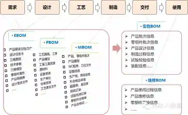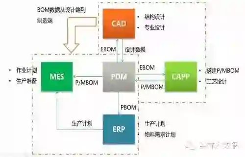 在CAD、PDM、CAPP、ERP、MES等研发相关的系统间集成共享BOM数据,打通企业生产研制主价值链,如下图所示: