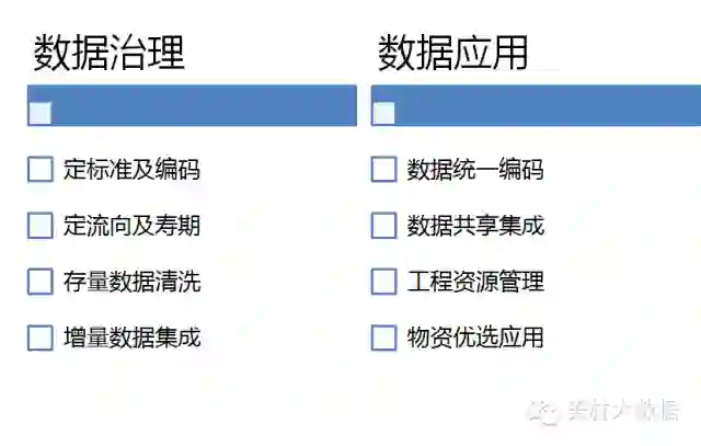 主数据管理工作分为主数据治理和主数据应用两部分,其中主数据治理包括数据标准制定,数据流向和U/C矩阵规划,IT系统诊断及优化等工作,主数据应用包括企业主数据的统一编码服务、数据共享分发服务,工程资源集成管理服务,物资采购优选服务等工作。