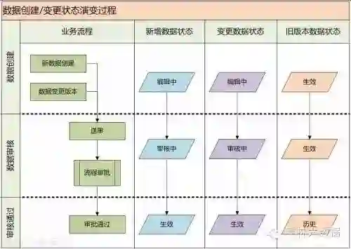 3、数据管理体系支撑:利用工作流技术实现主数据生命周期从数据创建申请开始,直到数据停用,历经申请、生成、审核、生效、变更、历史、封存等状态。