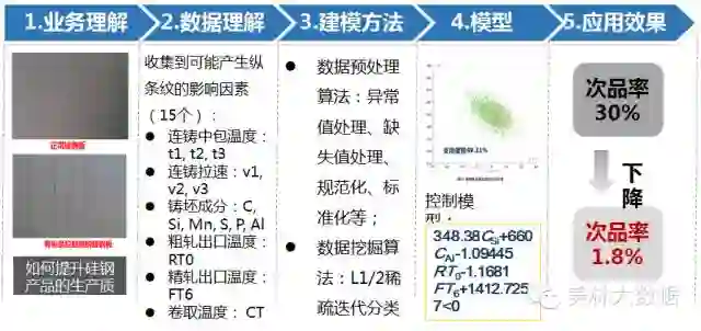 物联车间的质量控制:某钢铁企业是中国最大的特种钢材生产企业,在其某条硅钢生产线上,由于多种复杂因素的作用,成品表面有时会形成一种称为纵条纹的瓦楞状缺陷。纵条纹缺陷不仅影响产品的外观效果,而且对产品的物理性能如层间电阻,电磁性能和叠片性能等有着直接的影响,其纵条纹缺陷钢占生产量的30%左右,每年给企业带来巨大的损失。通过数据挖掘技术对生产工艺流程数据进行深入分析和挖掘,建立产品质量优化模型,减低次品率,提升产品质量。