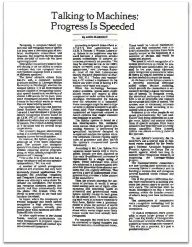 会后,《纽约时报》派记者 John Markoff 来到匹兹堡对我作了采访,文章发表于 1988 年 7 月 6 日,占了科技版首页的整个半版。在这篇文章里,马可奥夫大力报道了我的论文的突破。当时,我只觉得在和一个和蔼可亲的记者聊天,事后,我才知道这是一名才华横溢的著名记者,三次提名普利策奖,并在斯坦福兼教。