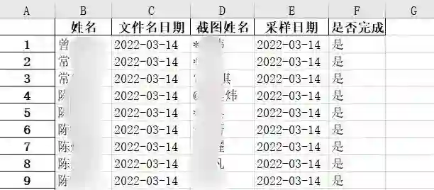 “使用正则表达式就可以把想要的信息从OCR识别的文本中筛选出来。最后,确认好每张截图里的姓名、检测时间和是否已采样等信息后,再把所有人的结果输出到Excel文件中,方便人工确认。”