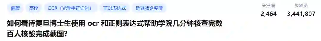 4月7日,根据复旦大学报道,学校信息科学与工程学院博士生李小康使用OCR和正则表达式帮助学院几分钟核查完数百人核酸完成截图,大大提高了核查效率和精度。
