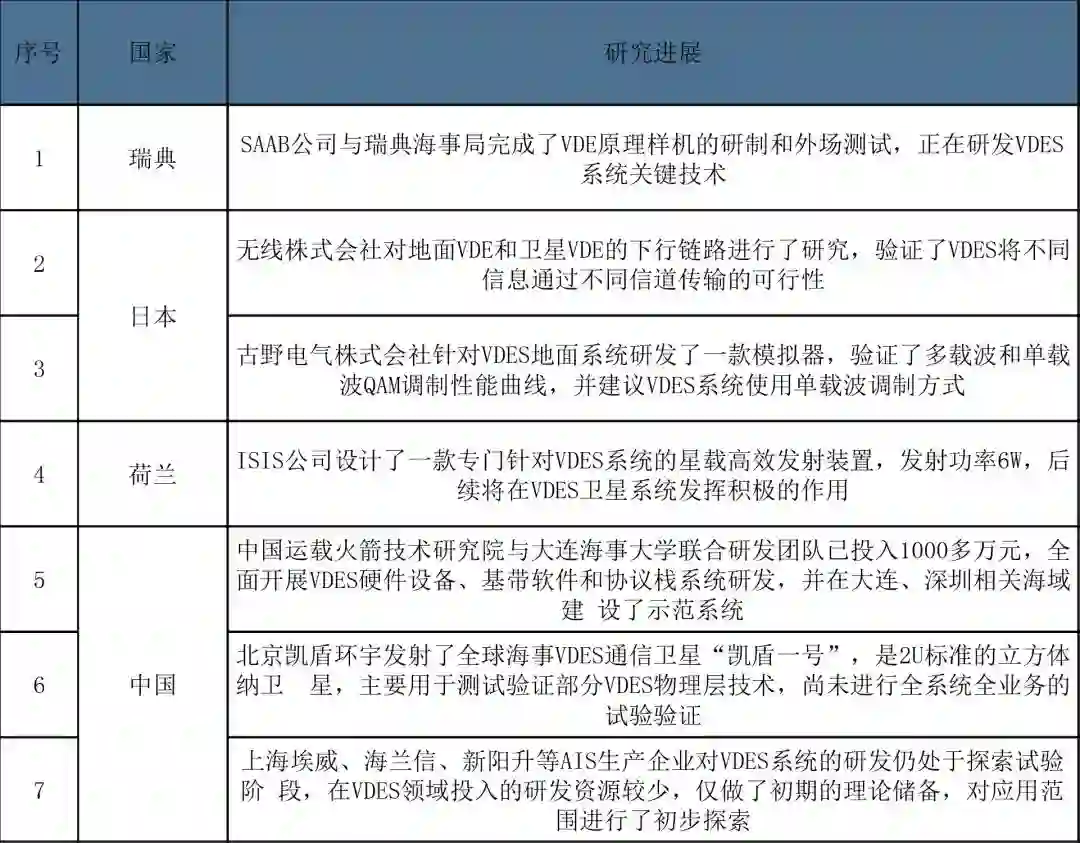 目前,国外VDES系统尚处于初步研发阶段,美国、欧洲、日本、韩国等国家的团队积极投入VDES系统的研发之中,以期在标准制定中掌握主动权,逐步拓展e–海战略的各项业务,从而占领国际航海市场。目前我国常规船舶国产设备的实际配套率只有30%左右,高新技术船舶国产设备的实际配套率仅20%左右,特别是附加值很高的船舶电子产品的本土化率尚不到10%, 这与我国造船工业的迅猛发展形成了非常大的反差,但也为我国企业进入船舶电子行业提供了难得的机遇。国内外VDES技术研究进展如表2所示。