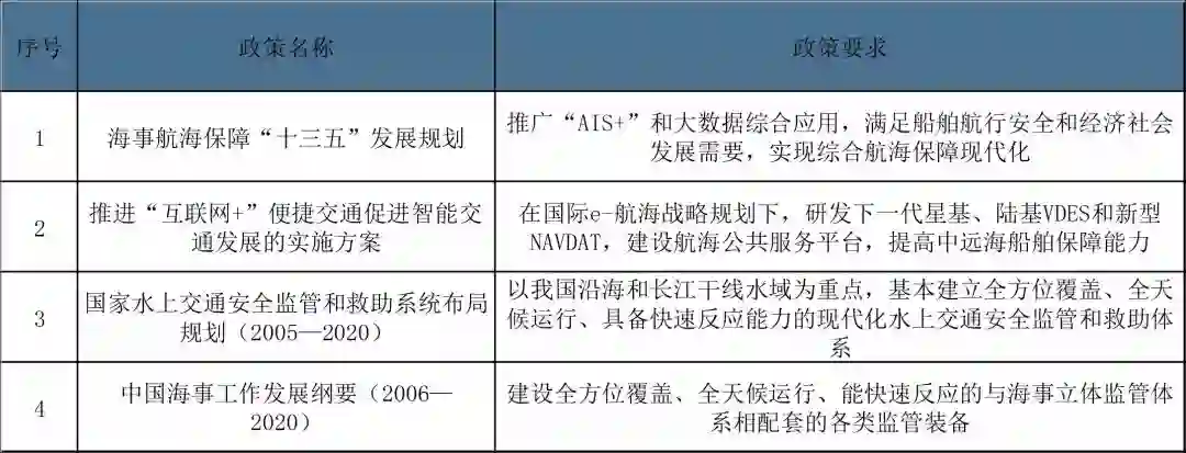 随着国际e–航海战略进入全面实施阶段,海上通信导航领域核心技术的自主可控是摆在我国面前需要迫切解决的重要课题。近年来,国家层面不断提出“海洋强国”“一带一路”“中国制造2025”等国家战略方针,各部委也相继出台多部行业发展纲要和政策规定,对我国船舶电子产业的发展远景、产业配套、自身建设等方面都进行了规划和要求,为我国船舶电子产业带来了巨大的发展机遇。现阶段,“十三五”规划已陆续出台了与我国海事工作相关的文件,鼓励VDES技术、卫星AIS等高科技产品的发展,并不断推动行业向标准化、规范化、精准化和定制化方向发展。在政策的大力推动下,可以预见在“十三五”末我国VDES 技术研制有望取得突破性的进展。国内相关政策及要求见表1。