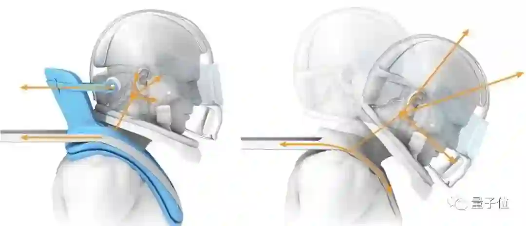 简单来看,它是一个可以卡在车手脖子上的U型装置,挂带能与车手的头盔连接。