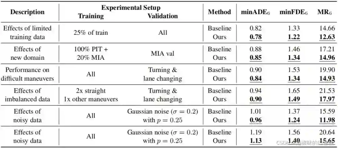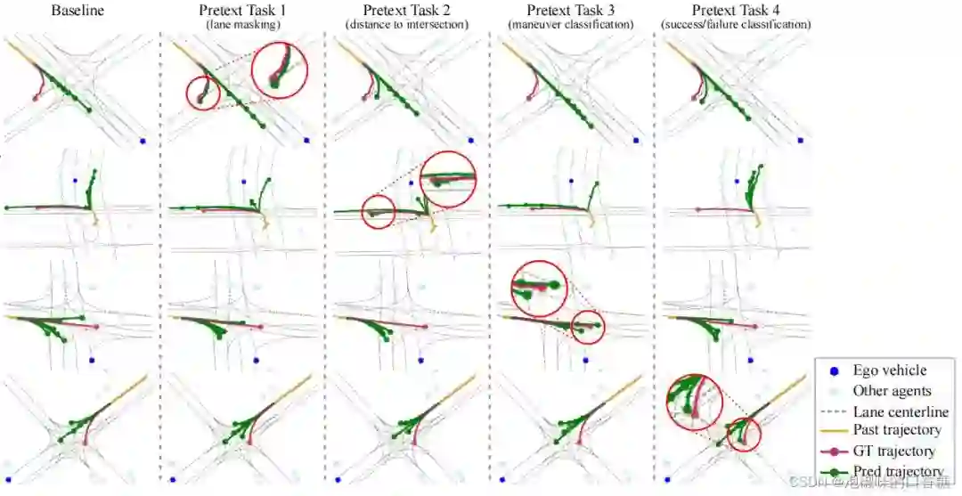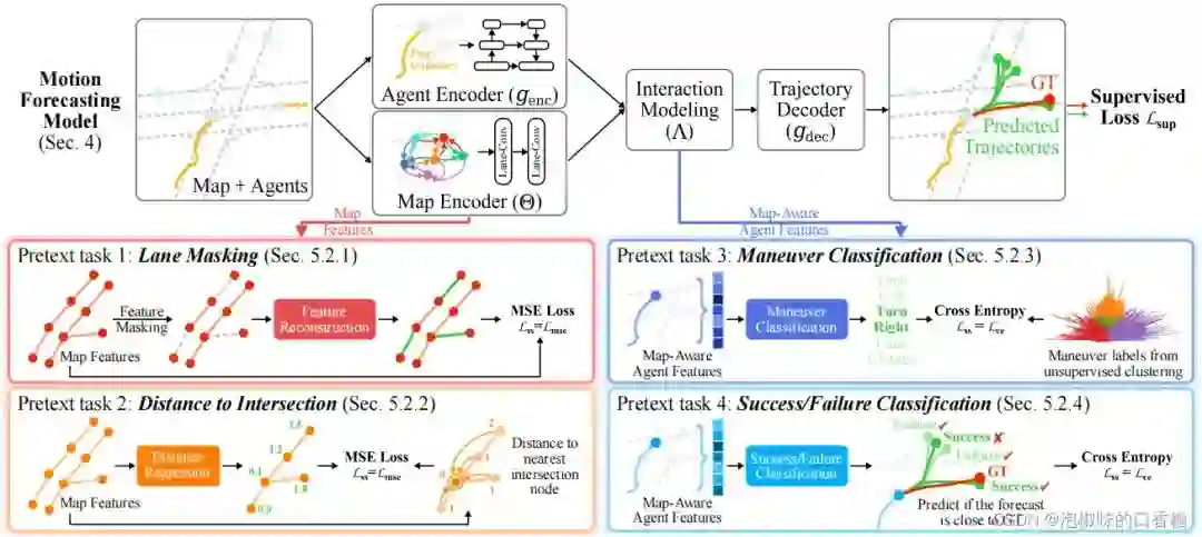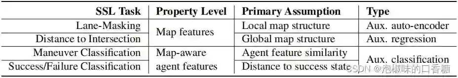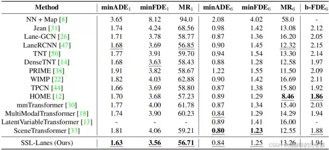 在2022论文"SSL-Lanes: Self-Supervised Learning for Motion Forecasting in Autonomous Driving"中,作者提出了SSL-Lanes,它以伪标签的形式利用从数据中生成的监控信号,并将其与标准的运动预测模型相集成,还在大规模Argoverse数据集上验证。SSL-Lanes的一个很大的优点是它具有高的准确性,同时具有低的架构复杂度和高的推理速度。作者还证明了所有提出的SSL假设性任务都比普通的运动预测基线有所改进,特别是在左/右转和加速/减速这样的困难情况。
