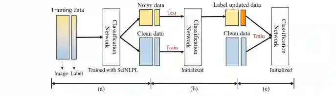 借助SelNLPL的过滤功能,可以将半监督学习方法应用于清洗数据和过滤噪声数据,并丢弃过滤后的有噪数据的标签。对于半监督学习,我们应用伪标记方法。Figure5展示了伪标记的整个过程。首先,使用通过SelNLPL训练的CNN将训练数据分为干净数据和有噪数据(Figure5(a))。接下来在Figure5(b)中CNN的输出更新噪声数据的标签。在这里我们使用软标签作为更新的标签。用于图像分类的典型标签是独热码矢量,而软标签只是经过训练的CNN输出。结果表明,更新标签时用软标签更好。最后,使用干净的数据和标签更新的噪声数据来训练重新初始化的CNN(Figure5(c))。这取得了SOAT精度,证明了SelNLPL的高过滤能力。结果展示在第5节中。