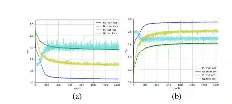 Figure2展示了PL和NL之间的明显区别。CNN在夹杂了30%对称噪声的CIFAR10数据集上PL或NL训练吗。我们使用的噪声将在第5节介绍。注意,虽然CNN是使用PL(公式1)或NL(公式2)训练的,但Figure2(a)中所有的损失均是由公式1计算的。使用PL,可在早期降低测试损失并提高测试精度。但是,因为最终CNN过度拟合了带噪声的训练数据,从而导致对干净数据的测试结果变差。相反,随着观察到的测试损失逐渐减少和测试准确率提高,NL被证明在训练CNN时不会过度拟合数据。