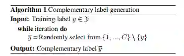 该互补标签是完全随机的,因为它是针对训练期间的每次迭代从除给定标签y之外的所有类别标签中随机选择的,如Algorithm1所示。等式(2)使补充标签的概率最优化为0,从而导致其他其他类别的概率值增加,从满足NL的要求。