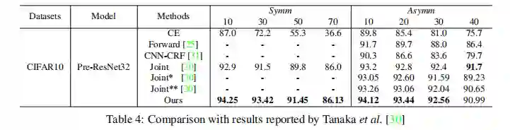 在本节中,我们将介绍为评估我们的方法而进行的实验。将SelNLPL之后的伪标记结果与用于噪声数据分类的其他现有方法的结果进行比较。为了证明我们的方法可以推广到各种环境,我们遵循其他的baseline方法的实验设置,这些实验在CNN架构,噪声数据集类型等存在不同,具体的实验测试结果如Table3,4,5,6所示。