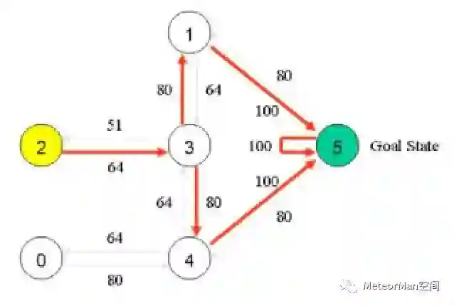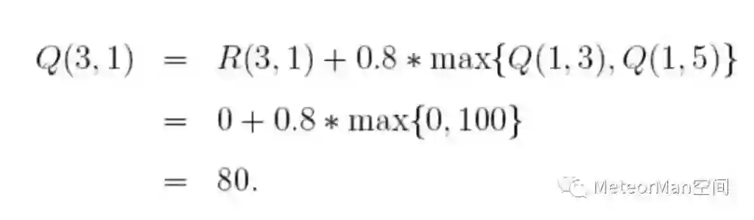 (2)状态3不是目标状态,继续查看状态3所对应的的R表,找到可能的下一个行为(到达1、到达2以及到达4),随机的选择到达1这个行为,根据状态转移方程计算Q(3,1):