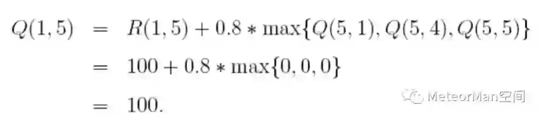 (2)状态1不是目标状态,继续查看状态1所对应的的R表,找到可能的下一个行为(到达3和到达5),随机的选择到达5这个行为,根据状态转移方程计算Q(1,5):