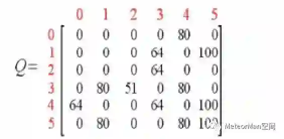 随后对其规范化,每个非零元素除以矩阵Q的最大元素值(此处为500),可得: