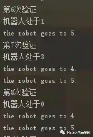 state = random.randint(0, 5)print('机器人处于{}'.format(state))count = 0while state != 5:if count > 20: # 如果尝试次数大于20次,表示失败print('fail')break# 选择最大的q_maxq_max = q[state].max()q_max_action = []for action in range(6):if q[state, action] == q_max: # 选择可行的下一个动作q_max_action.append(action)# 随机选择一个可行的动作next_state = q_max_action[random.randint(0, len(q_max_action) - 1)]print("the robot goes to " + str(next_state) + '.')state = next_state