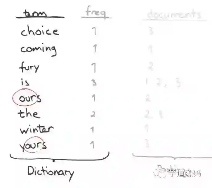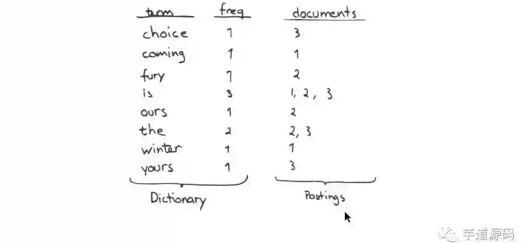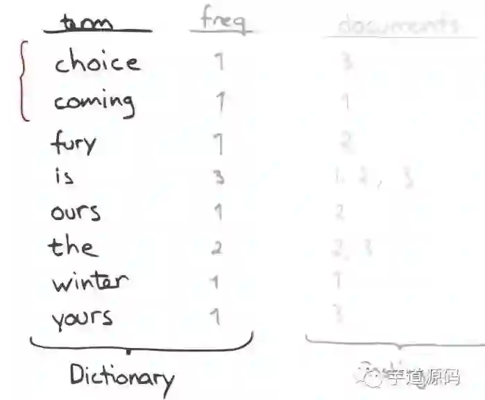 一个有序的数据字典Dictionary(包括单词Term和它出现的频率)。