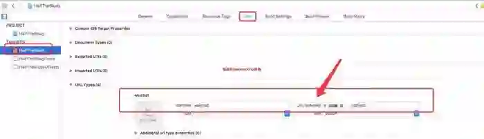 在Xcode中,选择你的工程设置项,选中“TARGETS”一栏,在“info”标签栏的“URL type“添加“URL scheme”为你所注册的应用程序id(如下图所示)。
