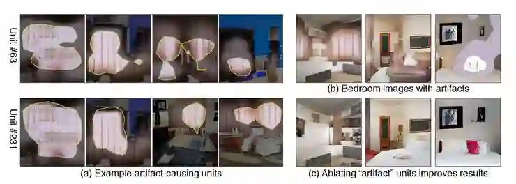 a) 为了排除故障,我们可以确定引入工艺品的那些单元… ;b) 和 c)可以 将它们去掉,来「修复」生成式对抗神经网络