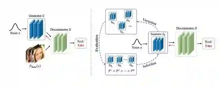 在传统设置中,通过利用反向传播交替更新生成器和判别器,来训练生成式对抗网络。这两层的 minmax 博弈通过利用目标函数中的交叉熵机制来实现。《进化的生成式对抗网络》作者提出了基于进化算法的可选择的生成式对抗网络框架。他们用进化问题的形式,重新表述了损失函数。生成器的任务是在判别器的影响下经受不断的变异。根据「优胜劣汰」法则,研究者认为生成器最终的生成以这种方式「进化」,从而学到正确的训练样本分布。