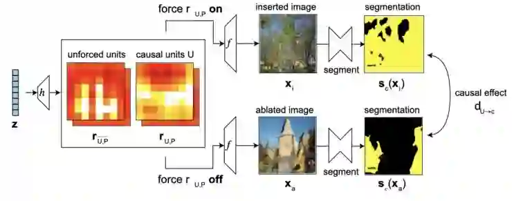 干预(intervention):在这一步骤中,我们确定了相关的级别。现在,我们尝试为每一级别找到最佳分离效果。这就意味着一方面,我们消除(抑制)弱的单元,以期让场景级别从生成图像中消失;而另一方面,我们又放大具有因果关系的单元对于生成图像的影响。通过这种方式,我们可以了解到它们对于显示场景级别 c 起到了多大的作用。最终,我们将级别 c 从两张图像中分割出来并进行比较。它们语义映射的一致性越小,级别的分离效果就越好,也就是说我们完全「证明出」了树对一张图像的影响,而第二张图像仅仅包含了一片丛林。