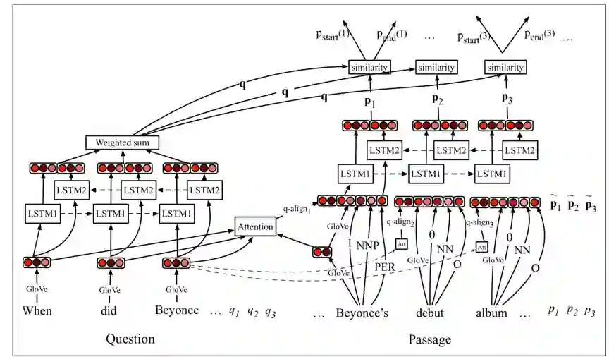 基于BiLSTM的答案抽取算法的代表模型是DrQA[3]。如下图所示是DrQA模型的整体架构。Passage embdedding由四部分组成:
