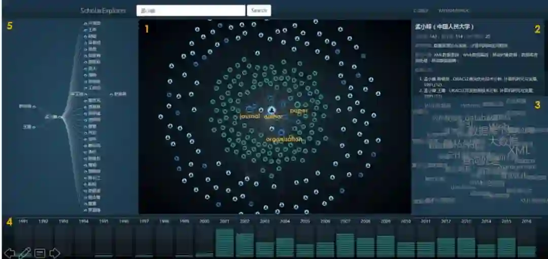 ScholarExplorer是一个展示学者信息的交互式分析网页工具,它在ScholarSearch和ScholarTree构建的国内学者数据基础上,直观展示学者与学者、单位的合作关系,期刊发表关系,发文量变化,研究领域、研究兴趣变化,以及师生关系。与传统的列表返回搜索结果方式,ScholarExplorer通过多种形式的图像和交互式的响应,为您提供有关学者更全面更生动的知识,是了解学者及其学术关系的新工具。