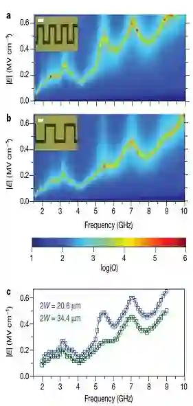 图2:(a)(b)薄膜样品在不同电极尺寸下,1 GHz至10 GHz测得的质量因子Q关于电场E的谐振谱;(c)图a和b中在每个频率的质量因子Q的最大值.