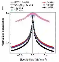 为了解除Q和n的互相限制,通过选取合适的衬底对Ba0.8Sr0.2TiO3施加微弱的拉伸应力,在薄膜中形成了90°头尾相接的平行于薄膜平面的铁电畴(图1a中的示意图所示)。在室温下,因为薄膜被施加的应力值极小并且十分接近居里相变温度,电容调制比n值在100 MHz至10 GHz间,其平均值高于13,数倍于之前报道的其他钙钛矿薄膜的可调电容(图1j所示)。