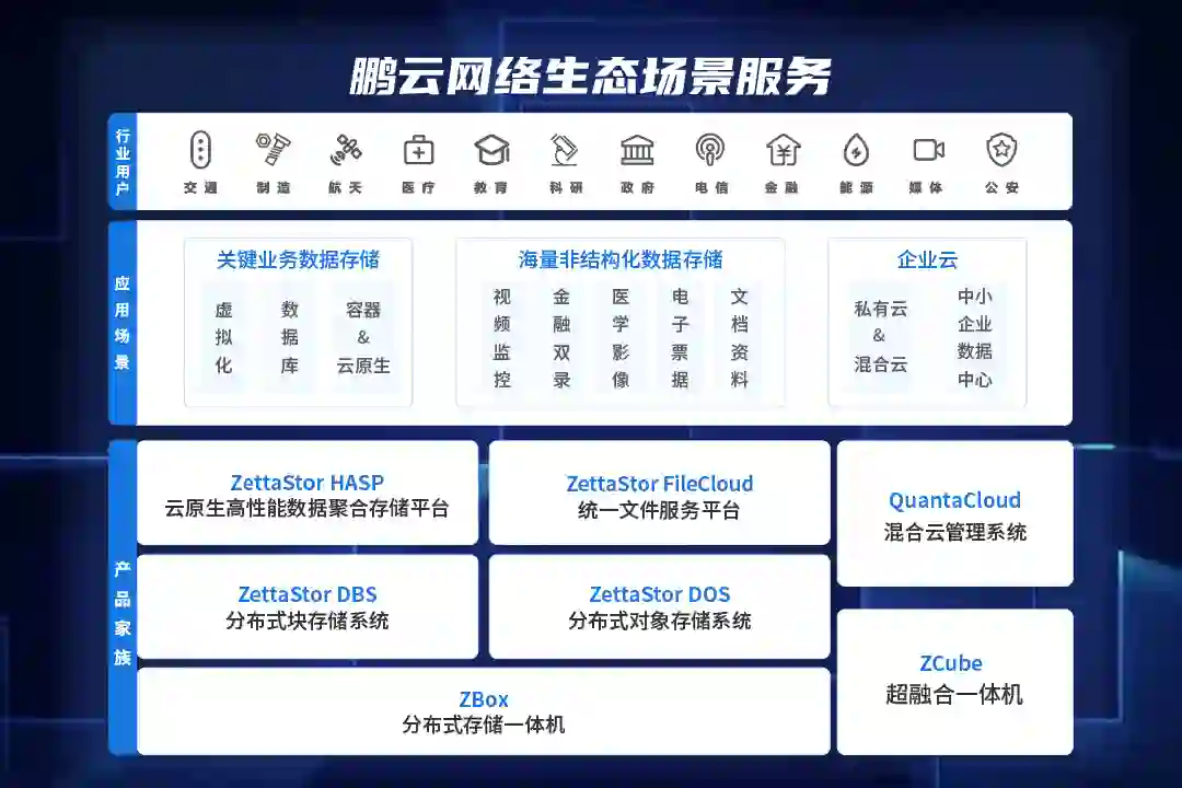 发展至今,鹏云网络已自主研发出ZettaStor系列存储产品,其中包含了统一文件服务平台FileCloud、分布式块存储系统DBS、分布式对象存储系统DOS等多个产品。在商业落地上,鹏云网络也参考国内市场现状,快速进行布局。目前,鹏云网络已经服务了20多个重点行业,超过200多家重点客户。