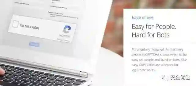 在Google于2009年买下专门提供CAPTCHA图像验证机制的reCAPTCHA之后,Google即不断强化reCAPTCHA的能力,在reCAPTCHA v1时代,或许使用者还记得在登入网站时,必须辨识并输入图像中扭曲的文字,在2014年推出的reCAPTCHA v2,则已进展到只需勾选"我不是机器人"(I'm not a robot)就能辨识是人类或机器人,让reCAPTCHA挑战退居第二线,估计有一半的使用者只透过勾选就通过了验证。